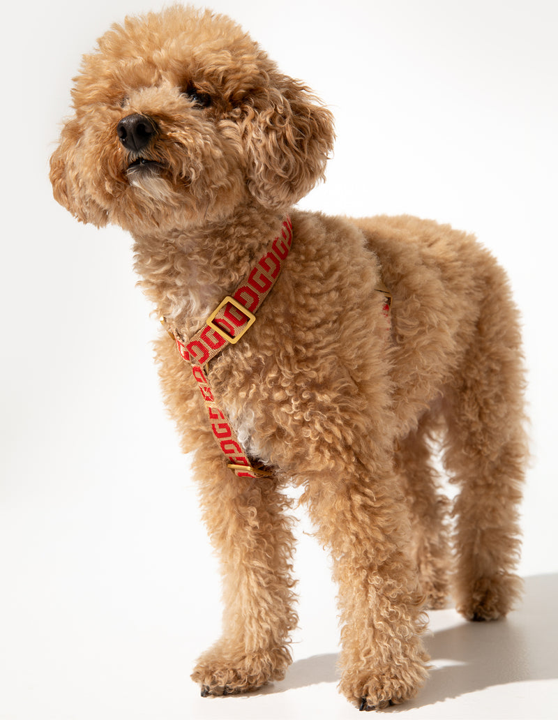 "Nylon hondenharnas met een ingeweven DG patroon. We raden aan om alleen met de hand te wassen en niet te strijken of drogen om deze kleuren helder en vrolijk te houden.