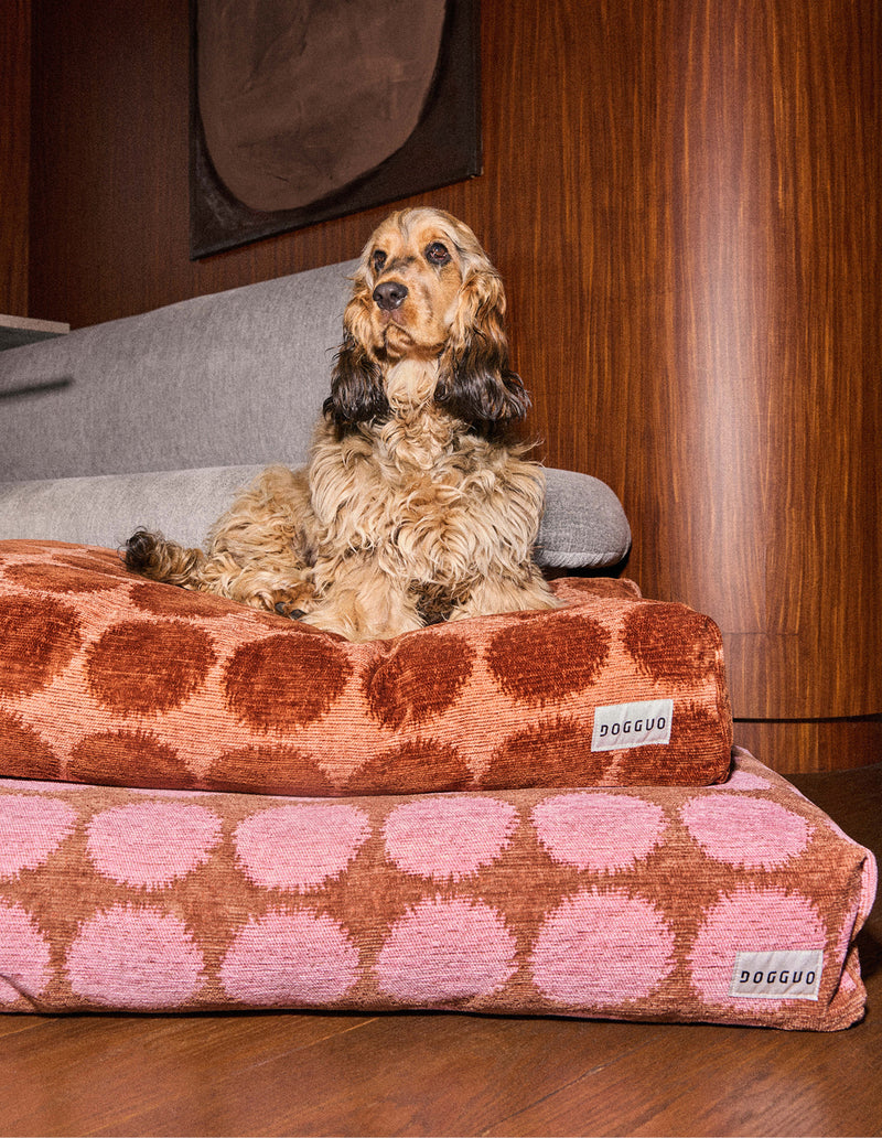 Hondenmand van jacquardstof met stip patroon. Dit bed heeft een vulling van memory foam vlokken in de mix met polyester vezels en is daarmee een orthopedische keuze voor jouw hond.