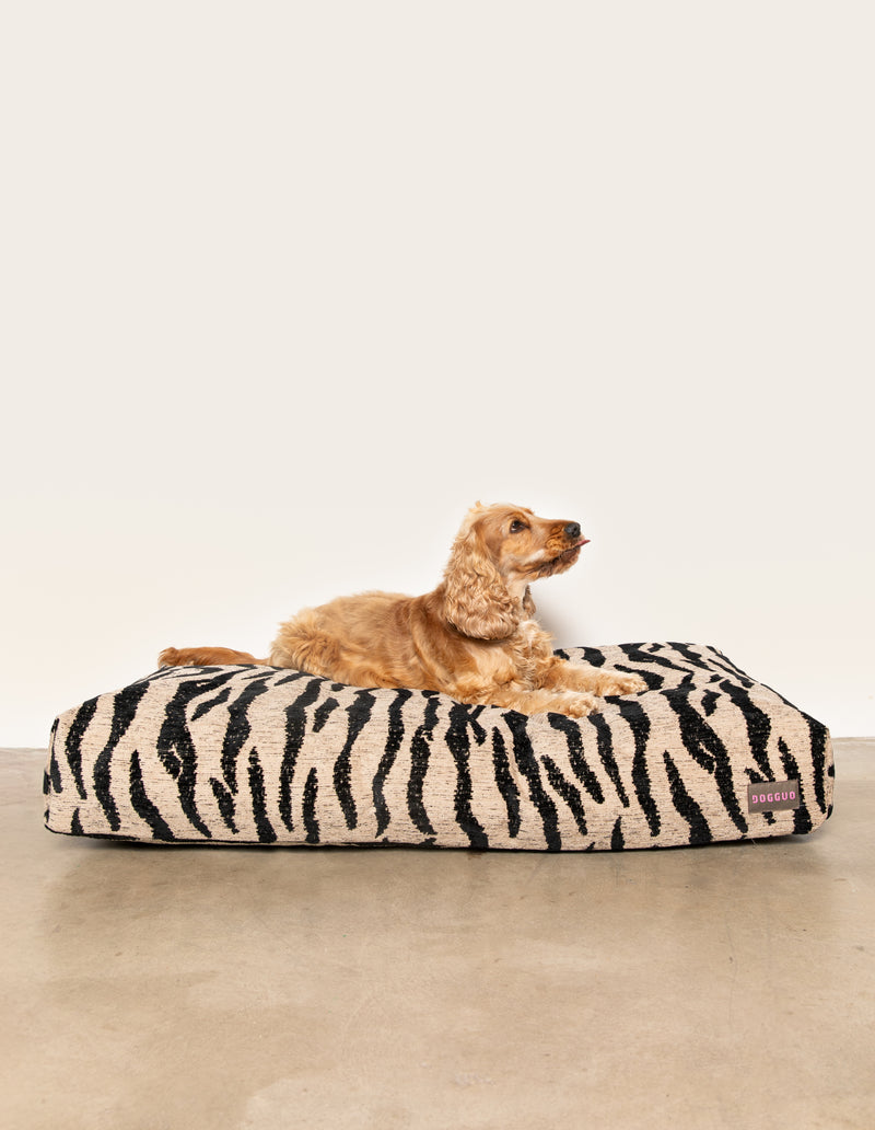 Hondenmand van jacquardstof met zebra patroon in beige en zwart. Dit bed heeft een vulling van memory foam vlokken in de mix met polyester vezels en is daarmee een orthopedische keuze voor jouw hond.