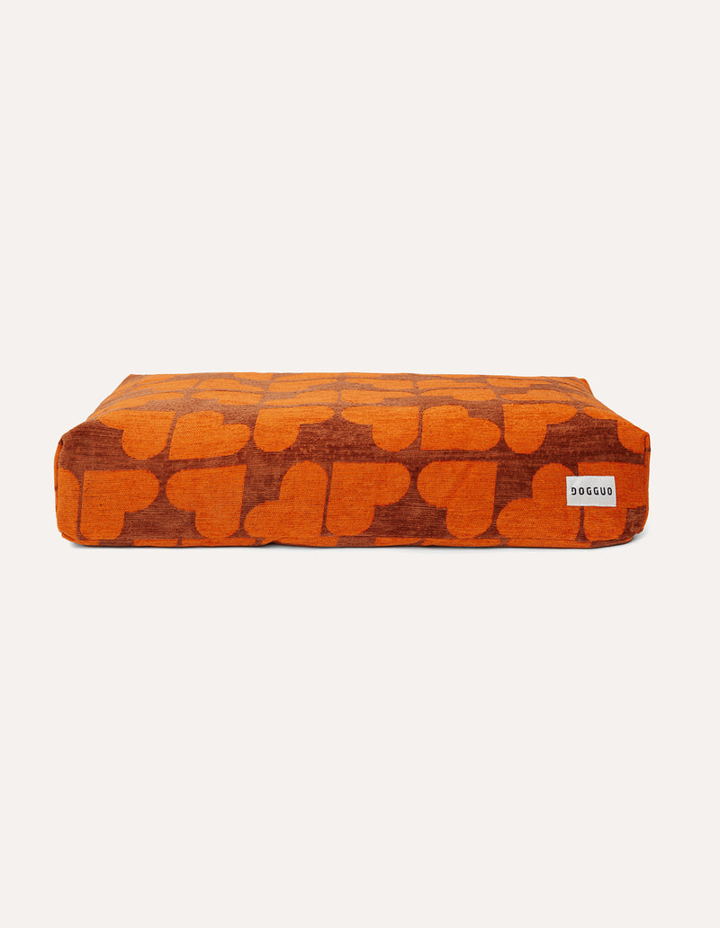 Dog bed made of jacquard fabric with a heart pattern. This bed features a filling of memory foam flakes mixed with sillicon fibers, making it an orthopedic choice for your dog.